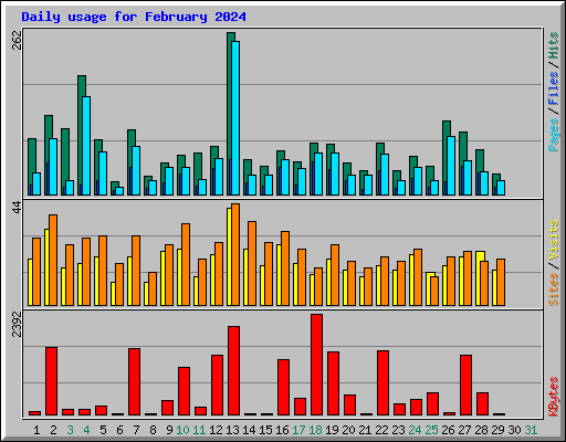 Day | Hits | Files | Pages | Visits | Sites | KBytes | ||||||