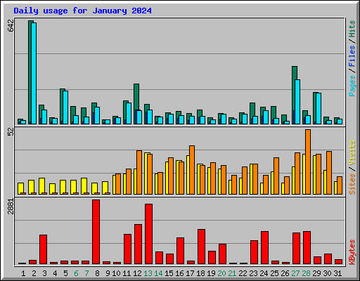 Day | Hits | Files | Pages | Visits | Sites | KBytes | ||||||